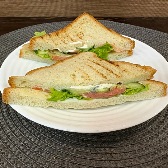 Состав: Хлеб, лист салата, семга с/с, сыр плавленный, огурец свежий, зелень. В 100 гр. Продукта содержание жира – 14 гр. Белка – 9,5 гр. Углеводов –14 гр. Энергетическая ценность – 270 ккал. Условия хранения при t — 4 + 2 C – 3 суток. Производитель ООО «Продторг»